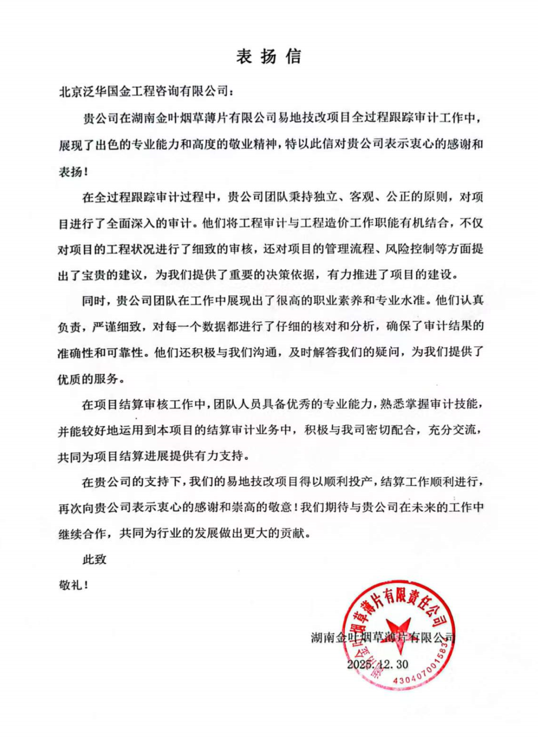 我司收到湖南金叶烟草薄片有限公司感谢信,感谢我司在易地技改项目全过程跟踪审计工作中,不仅对项目的工程状况进行了细致的审核,还对项目的管理流程、风险控制等方面提出了宝贵的建议,展现了出色的专业能力和高度的敬业精神。