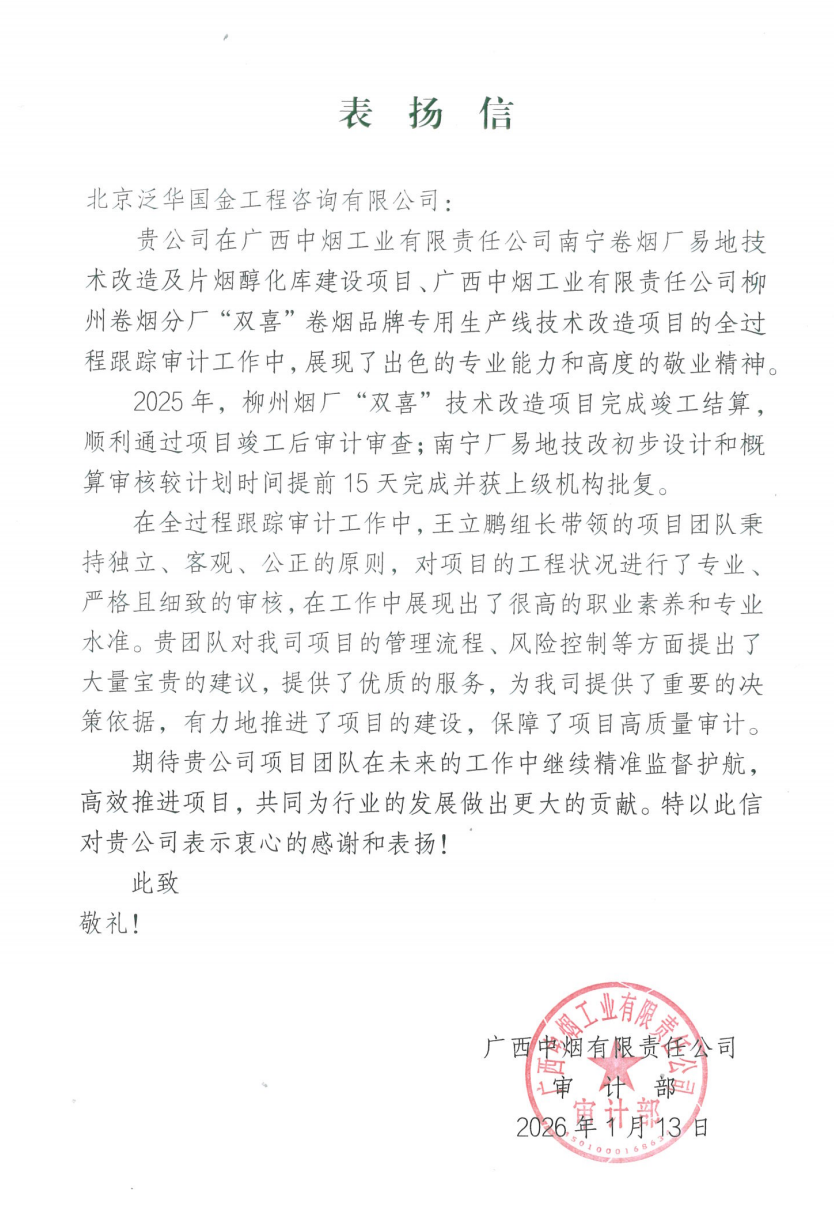 我司收到广西中烟工业有限责任公司发来的表扬信。表扬我司在南宁卷烟厂易地技术改造及片烟醇化库建设项目、柳州卷烟分厂"双喜"卷烟品牌专用生产线技术改造项目的全过程跟踪审计工作中展现了出色的专业能力和高度的敬业精神,有力地推进了项目的建设,保障了项目高质量审计。