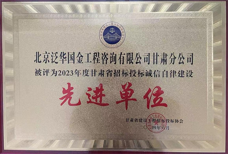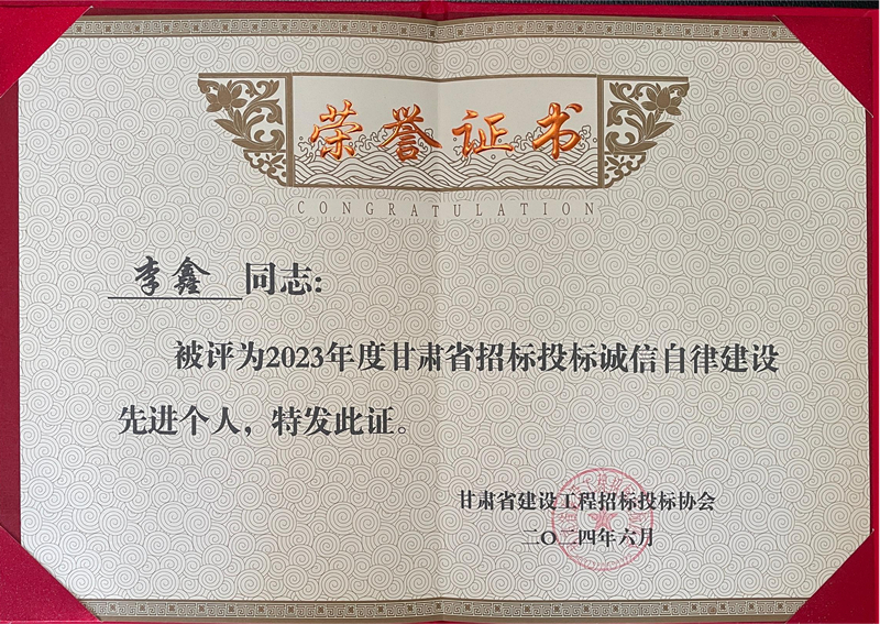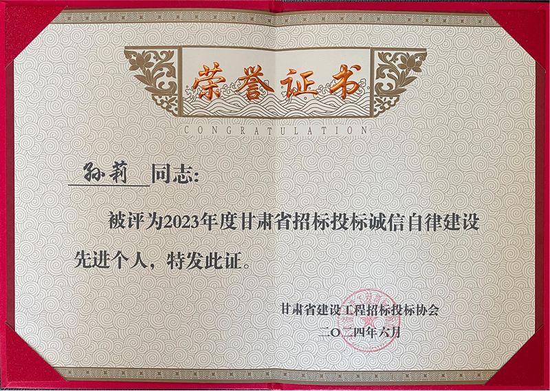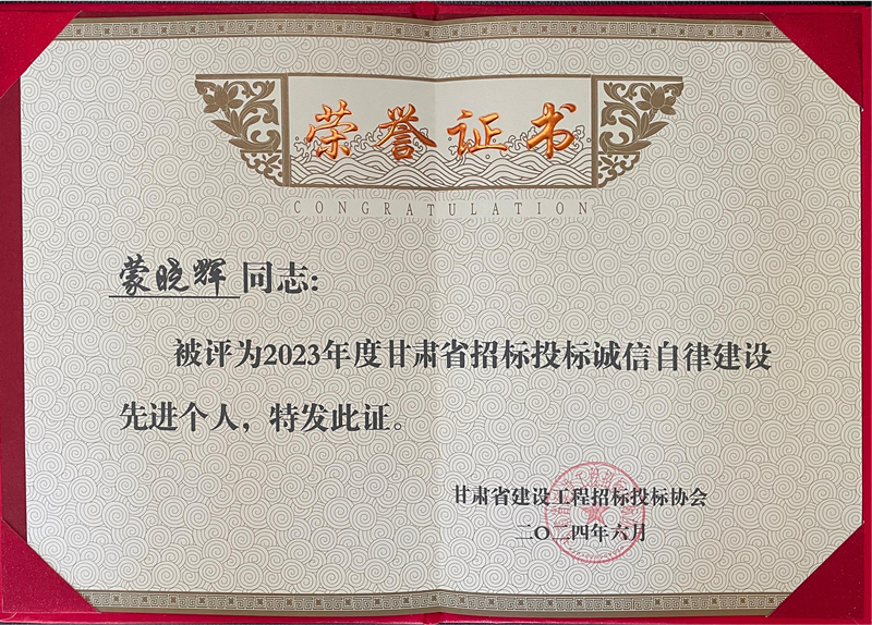 我司甘肃分公司被甘肃省建设工程招标投标协会评为2023年度甘肃省招标投标诚信自律建设先进单位,同时,蒙晓辉、李鑫、孙莉三名员工荣获2023年度甘肃省招标投标诚信自律建设先进个人称号。