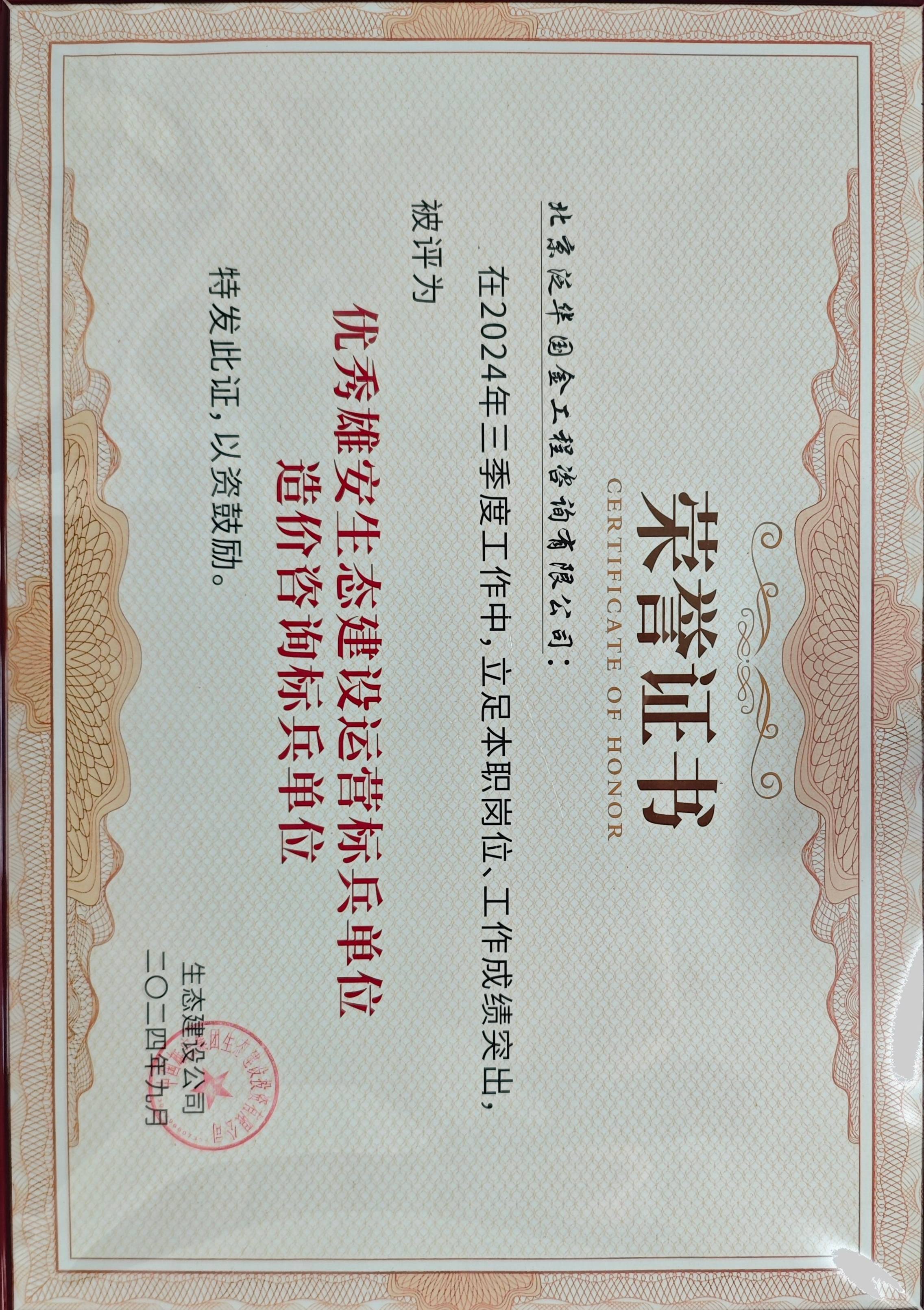 我司被雄安集团生态建设公司评为造价咨询标兵单位