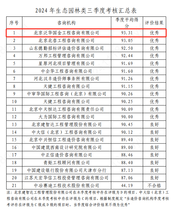 在雄安集团生态建设公司2024年造价咨询机构季度综合评比中,我司被评为优秀雄安生态建设运营标兵单位造价咨询标兵单位,在21家服务单位中位列第一。