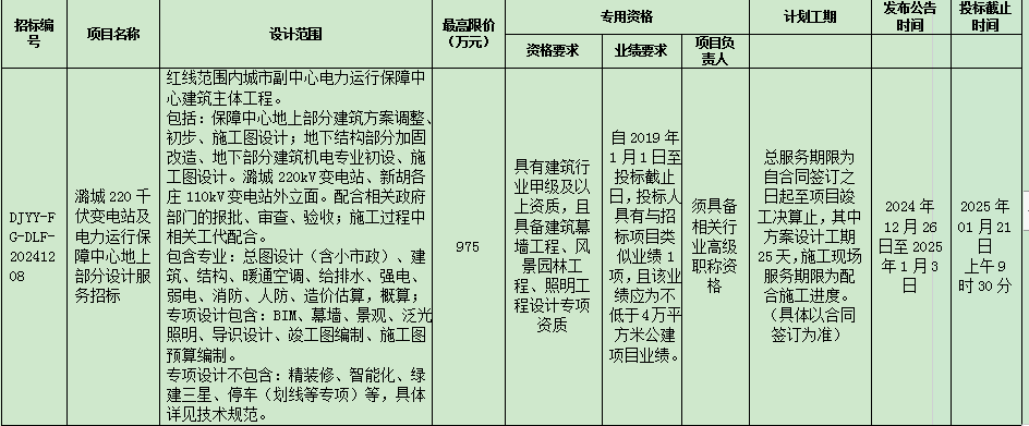 发布人:[] 发布时间:[2024-12-27]潞城220千伏变电站及电力运行保障中心地上部分设计服务招标招标公告
